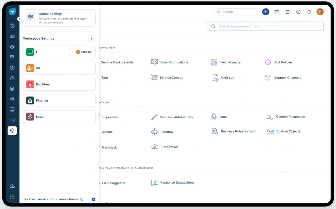 Tanto para los departamentos de TI, RR. HH., Infraestructura o Jurídico, facilitar Freshservice a los distintos equipos empresariales elimina la necesidad de usar varias herramientas y ofrece a su personal un entorno de servicios uniforme.